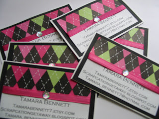 Hey everyone! I just thought I'd share these business cards that I made last night. I did 40 of them in under 3 hours. I thought that was pretty good timing. I had fun making them too. I cut out all the sizes and shapes that I needed, then I took it all to the living room and assembled them while I watched Saturday Night Live. I've put them in