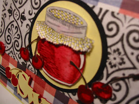 The word Sweet was an altered SVG file that I got from the Vendibles Blog. I added cherries to it. If you'd like the file, it's a freebie: Sweet Cherries Title Svg. To get the 3-D effect of the cherries and the cloth on the lid, I printed out the stamp 2 times exactly the same size. Then I cut out the part that I wanted to be 3-D and added it on top of the original stamp. I then used 3-D pop dots to make them stand out.